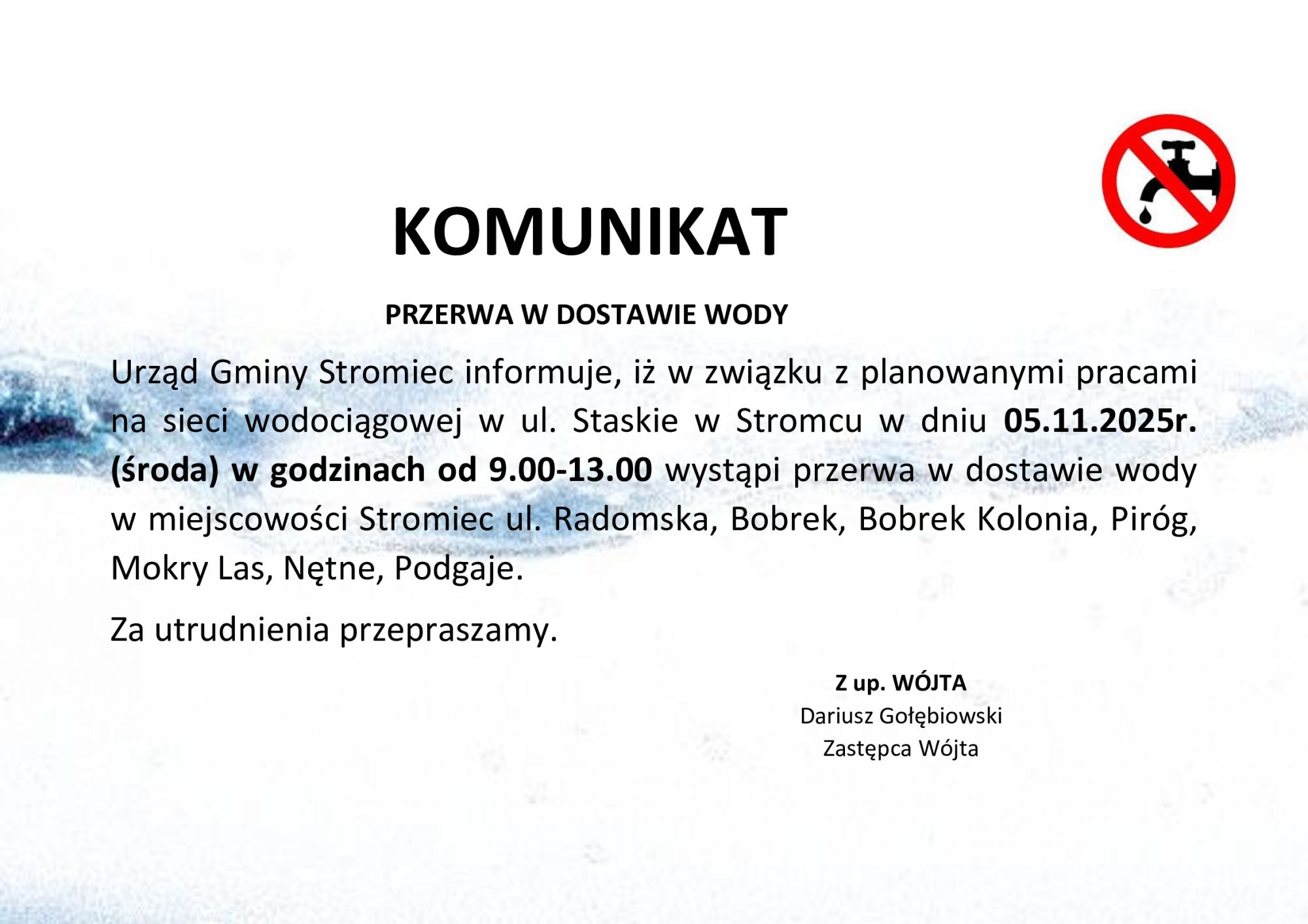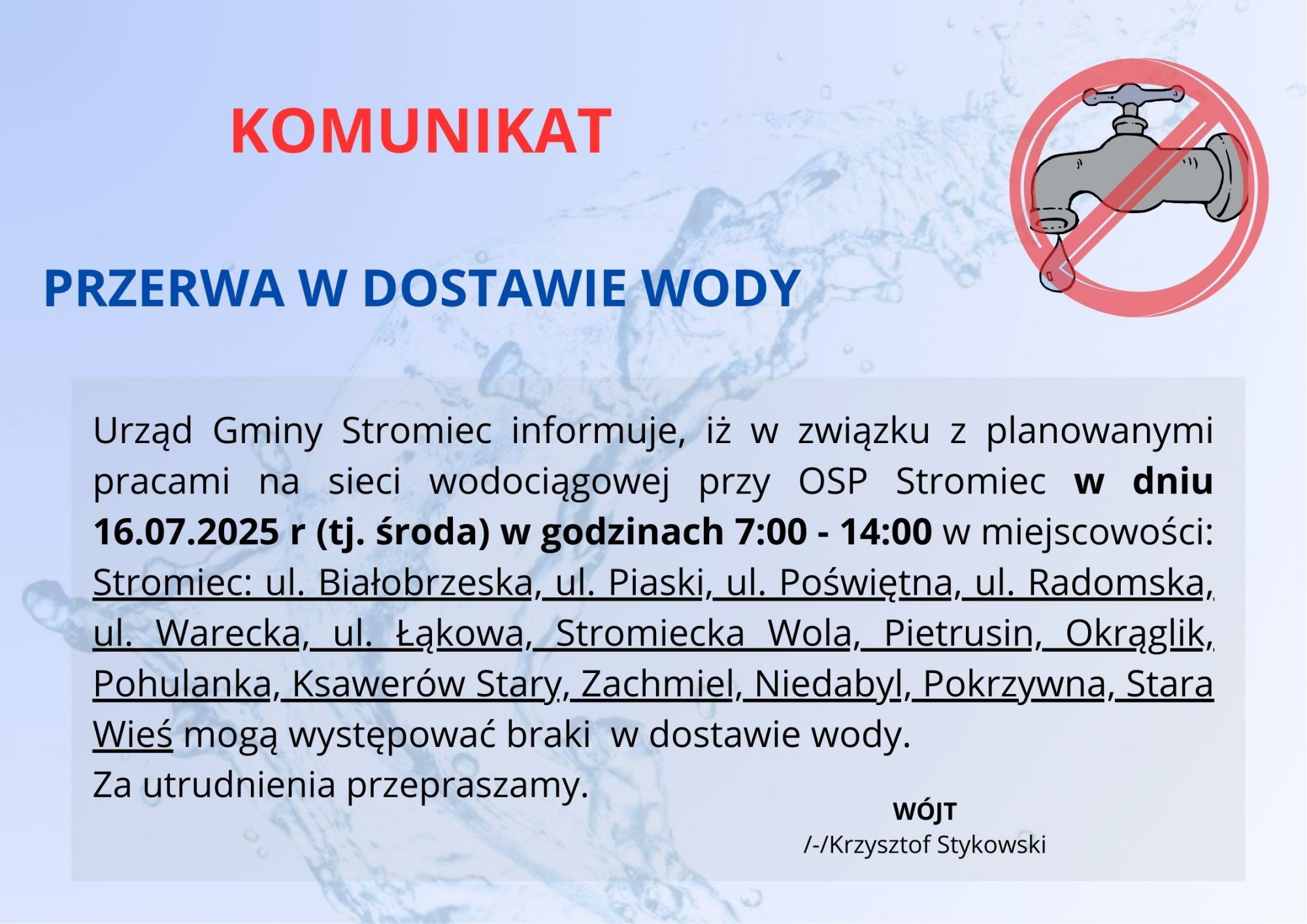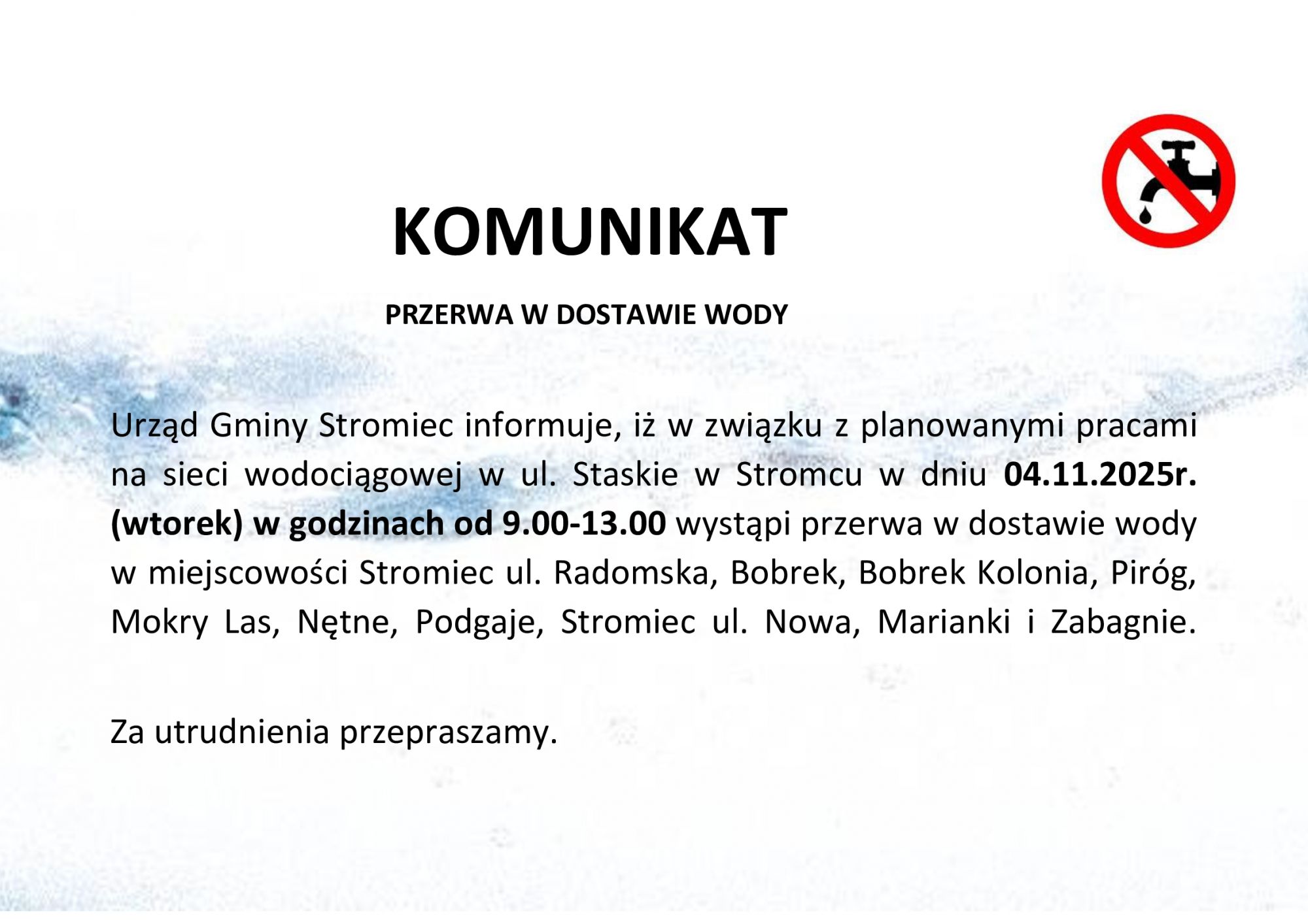 Komunikat przerwa w dostawie wody