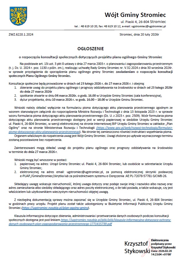 OGŁOSZENIE W związku z przystąpieniem do sporządzenia Gminnego Programu Rewitalizacji Gminy Stromiec na lata 2024–2030, Wójt Gminy Stromiec zaprasza do przedstawienia propozycji projektów rewitalizacyjnych do realizacji na wyznaczonym obszarze rewitalizac